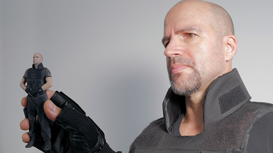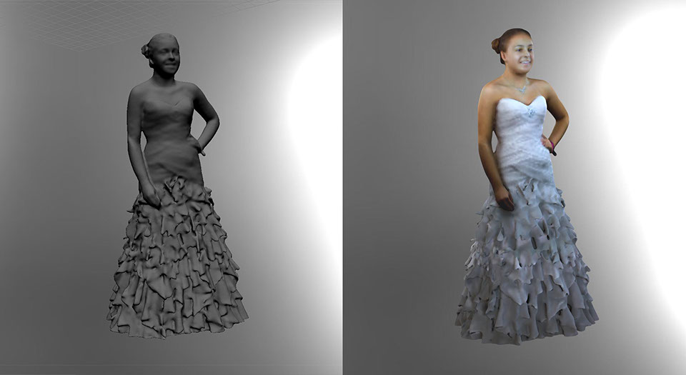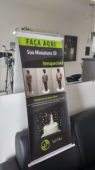 A pessoa se posiciona em um plataforma giratório de 60cm, e o escanemento é feito de forma automática em 40 segundos utilizando três escâners simultaneamente.